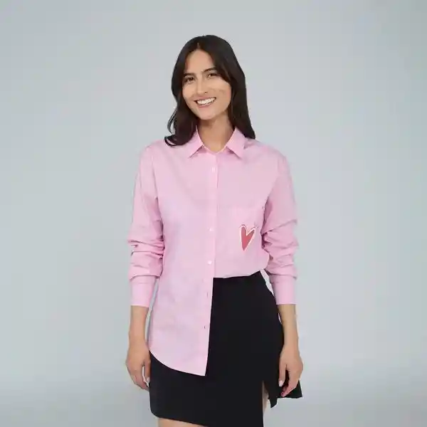 Camisa rosada de cuello clásico y cierre frontal con botones. Manga larga con prenses en los puños abotonados, bolsillo en el delantero y almilla en la espalda. Presenta estampado gráfico en el bolsillo y en la almilla. Esta prenda hace parte de una colaboración especial con la Fundación AMESE, en apoyo a mujeres que enfrentan el cáncer de mama. Por la compra de este producto, se donará el 10% a la fundación. Composición: 97% Algodón, 3% Spandex La modelo mide 1.73 m y usa talla M. Cuidados especiales: Leer la etiqueta de cuidados antes de lavar.