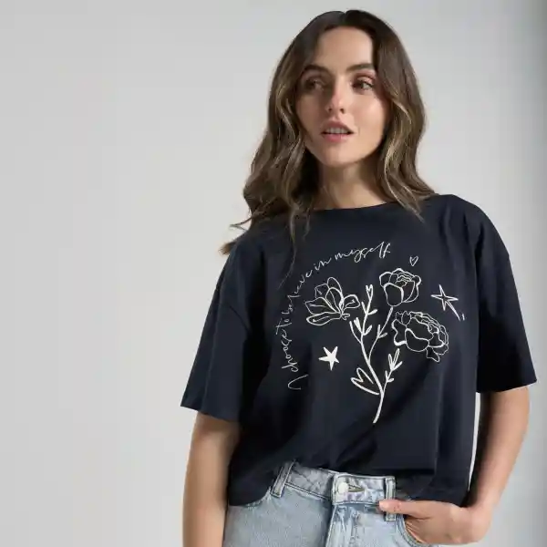 Camiseta oversize color azul oscuro,cuello redondo y abertura en los costados. Serigrafía en el frente. Composición: 100% algodón. La modelo mide 1,73 cm y esta usando talla S Cuidados especiales de la prenda: No planchar el estampado. Leer la etiqueta de cuidados.
