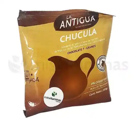 Alimento en polvo a base de harinas de Maíz con cacao tipo chucula listo para preparar. Chocolate 7 granos, 0% colesterol, producto tradicional. Preparación: 1. Tibie agua o leche 2. Agregue media cucharada sopera de chocolate La Antigua por pocillo o taza 3. Bata con un molinillo hasta obtener espuma deseada. 4. Si desea puede licuar para obtener mejores resultados