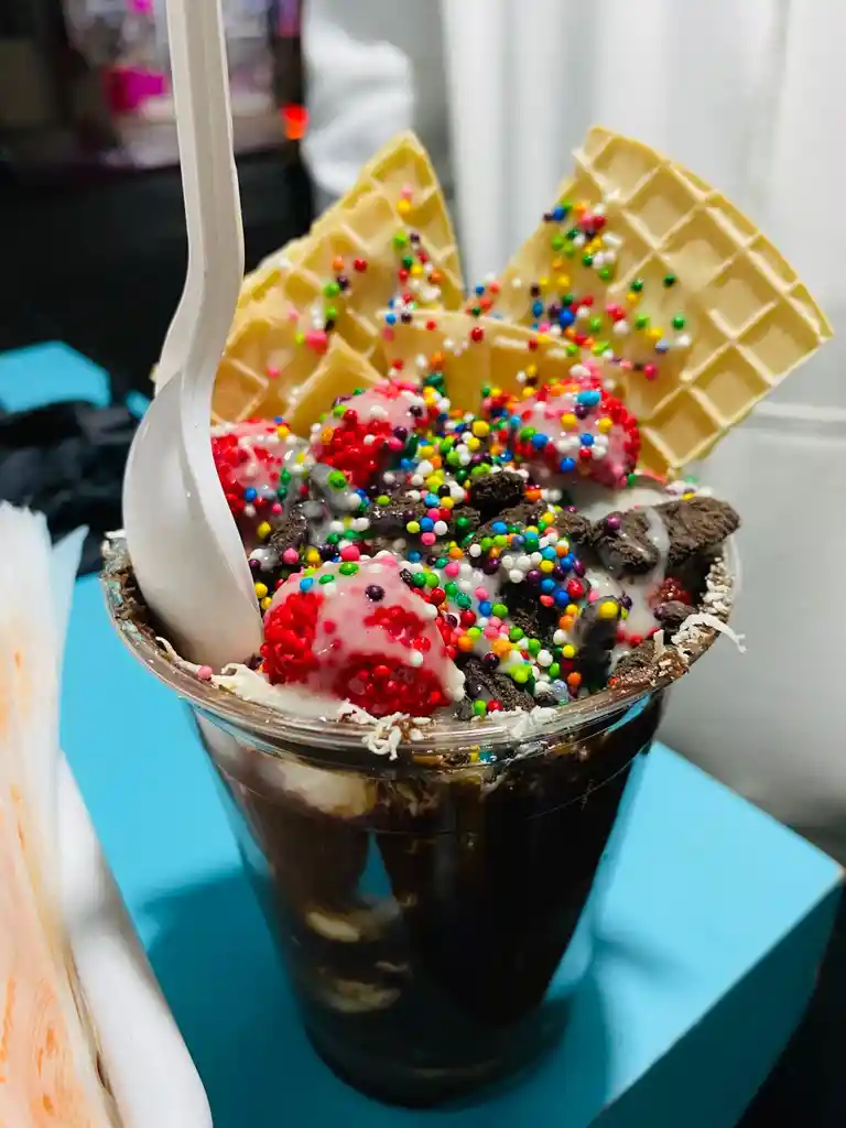 vaso forrado en Arequipe o Nutella + Crema de la casa + Queso + 1 Fruta + 2 Toppings + 1 Salsa