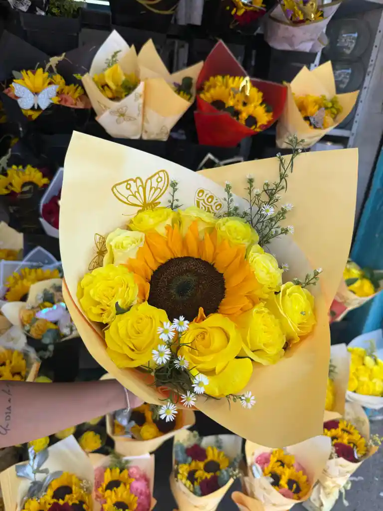 No hay forma de no sonreír con este bouquet! Nuestro diseño especial pone un girasol radiante en el corazón, cuidadosamente rodeado de rosas amarillas que forman una corona de pura alegría. Para darle ese toque silvestre y fresco, añadimos el encanto del monte casino, y lo sellamos todo en nuestro elegante papel coreano, adornado con detalles de mariposas. Es el regalo perfecto para celebrar la amistad, un logro o simplemente para alegrar el día a esa persona especial. 🦋