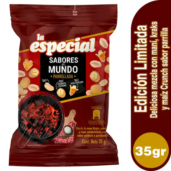 Mezcla de maní kraks, maní y maní semi-estallado, con sabor artificial a parrillada. Ideal para disfrutar de su sabor en fiestas y celebraciones.