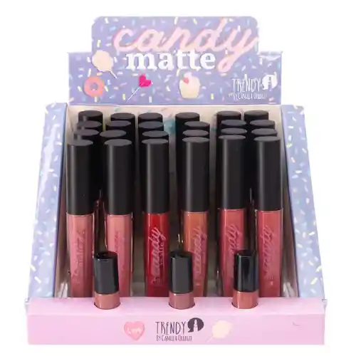 El labial Candy Matte de Trendy ofrece un color intenso y uniforme con un acabado mate, y está disponible en una variedad de 12 tonos, incluyendo rojizos, rosados, tonos chocolate y coral. -Acabado y Textura: Proporciona un acabado mate sin cuartearse, lo cual es un punto a favor según los usuarios. La fórmula es descrita como ligera y cremosa, lo que permite una aplicación cómoda y precisa. -Pigmentación y Duración: Cuenta con una excelente pigmentación y una duración de 3 a 4 horas en los labios, sin transferirse. -Ingredientes y Cuidado de Labios: Contiene ingredientes emolientes como cera de abejas, cera de carnauba y aceite mineral, que ayudan a hidratar y suavizar los labios, evitando la sensación de resequedad. Se recomienda exfoliar los labios regularmente para un mejor resultado. -Aroma: Reseñas mencionan que tiene un aroma agradable y dulce ("huele súper rico")