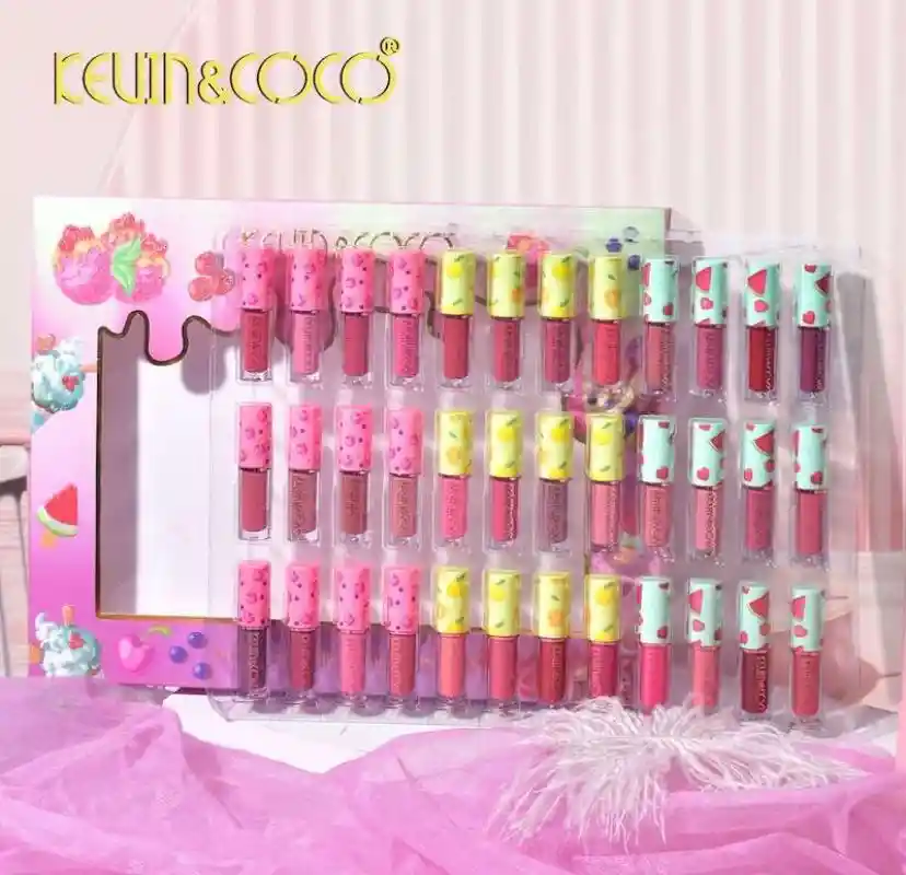 36 tonos vibrantes diseñados para dar brillo y glamour a los labios. Los tonos son altamente pigmentados y de larga duración. Ofrece una variedad de tonos y texturas, incluyendo acabados mate y brillantes, adecuados para diferentes looks y ocasiones. El precio de este set es de $88.900. Kevin & Coco es una marca de cosméticos que se enfoca en productos veganos y libres de crueldad animal