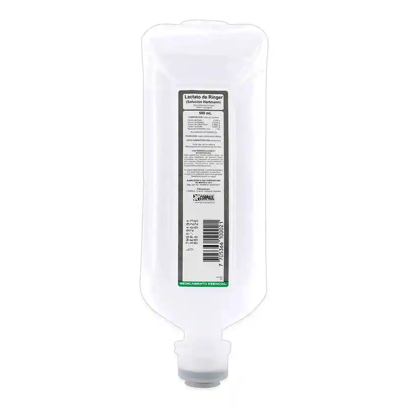 Lactato de Ringer Hartman 500 ml – Corpaul Solución intravenosa indicada para la rehidratación y restauración de los electrolitos en animales que requieren un tratamiento para deshidratación o pérdida de líquidos debido a diversas afecciones. Ideal para casos de shock, desequilibrio ácido-base y deshidratación severa, ayudando a mantener la homeostasis y estabilizar la condición clínica del animal. Composición: Cloruro de sodio Lactato de sodio Cloruro de potasio Cloruro de calcio Agua purificada Indicaciones: Uso veterinario para animales de diferentes especies. Administrar bajo supervisión de un profesional de la salud animal. Presentación: 500 ml