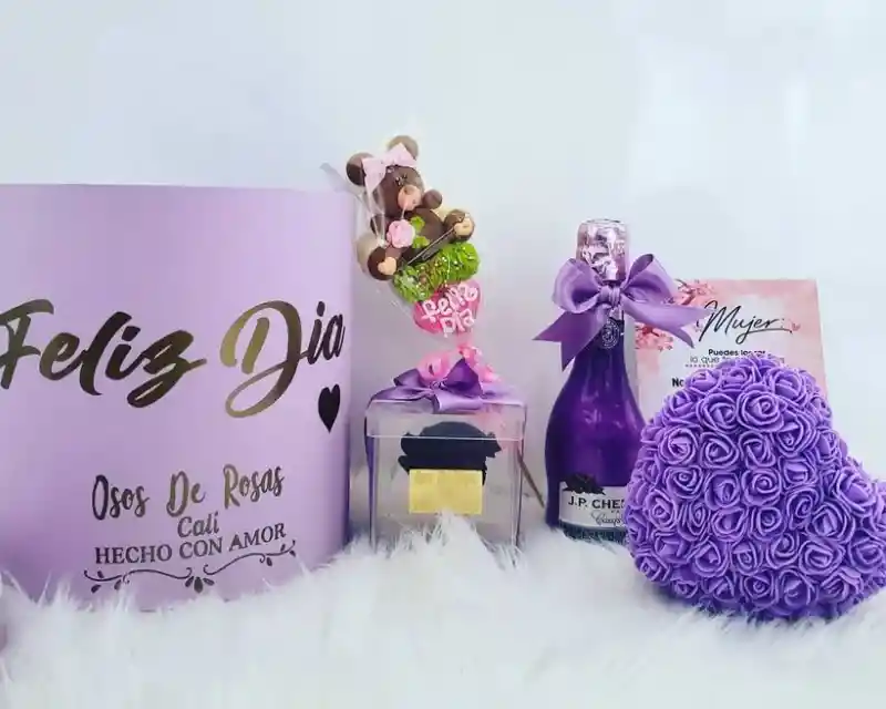HERMOSO CILINDRO COLOR A ELECCIÓN CON ROSA PRESERVADA, MASMELO EN FORMA DE OSO, MEDIA BOTELLA DE JP CHENET, CORAZÓN DE ROSAS, Y TARJETA CON MENSAJE PERSONALIZADO.