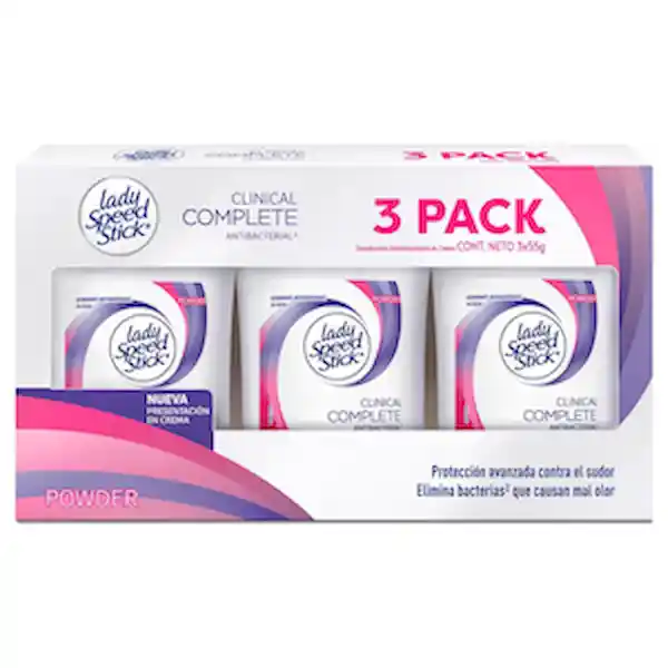 Pack Lady Speed Stick Contiene 3 Unidades de 55 g c/u. Lady Speed Stick Clinical Complete Antibacterial es el Desodorante Ideal Con 72 Horas de Protección Que Eliminan Las Bacterias Que Causan el Mal Olor. Fácil y Práctica Aplicación. Tecnología de Protección Avanzada.