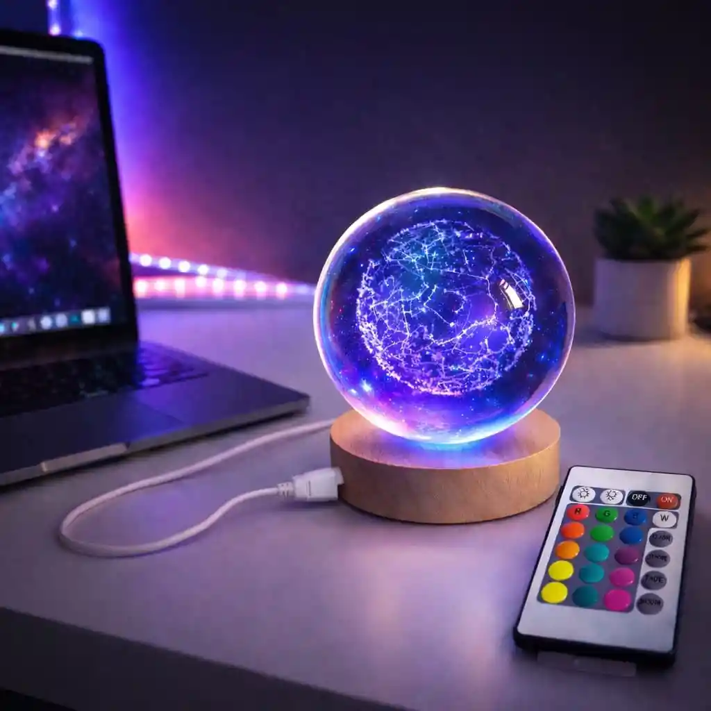 La lámpara bola de cristal 3D galaxia es una pieza decorativa moderna que crea un efecto visual espectacular en cualquier espacio. Su diseño con grabado láser muestra una galaxia iluminada que cambia de color, creando un ambiente relajante y elegante. Incluye control remoto para cambiar fácilmente los colores, efectos y niveles de iluminación. Es perfecta para decorar habitaciones, escritorios, salas, oficinas o espacios gamer. Funciona mediante conexión USB, lo que la hace práctica y fácil de usar con cargadores, computadores o power banks. Características * Diseño de bola de cristal con galaxia 3D * Iluminación LED multicolor * Control remoto incluido * Base decorativa tipo madera * Alimentación por USB * Ideal para decoración de habitaciones, escritorios o ambientes gamer Contenido * 1 Lámpara bola cristal galaxia LED * 1 Base de madera con luz LED * 1 Control remoto * 1 Cable USB Perfecta para decoración moderna, regalos o crear un ambiente relajante en cualquier espacio.