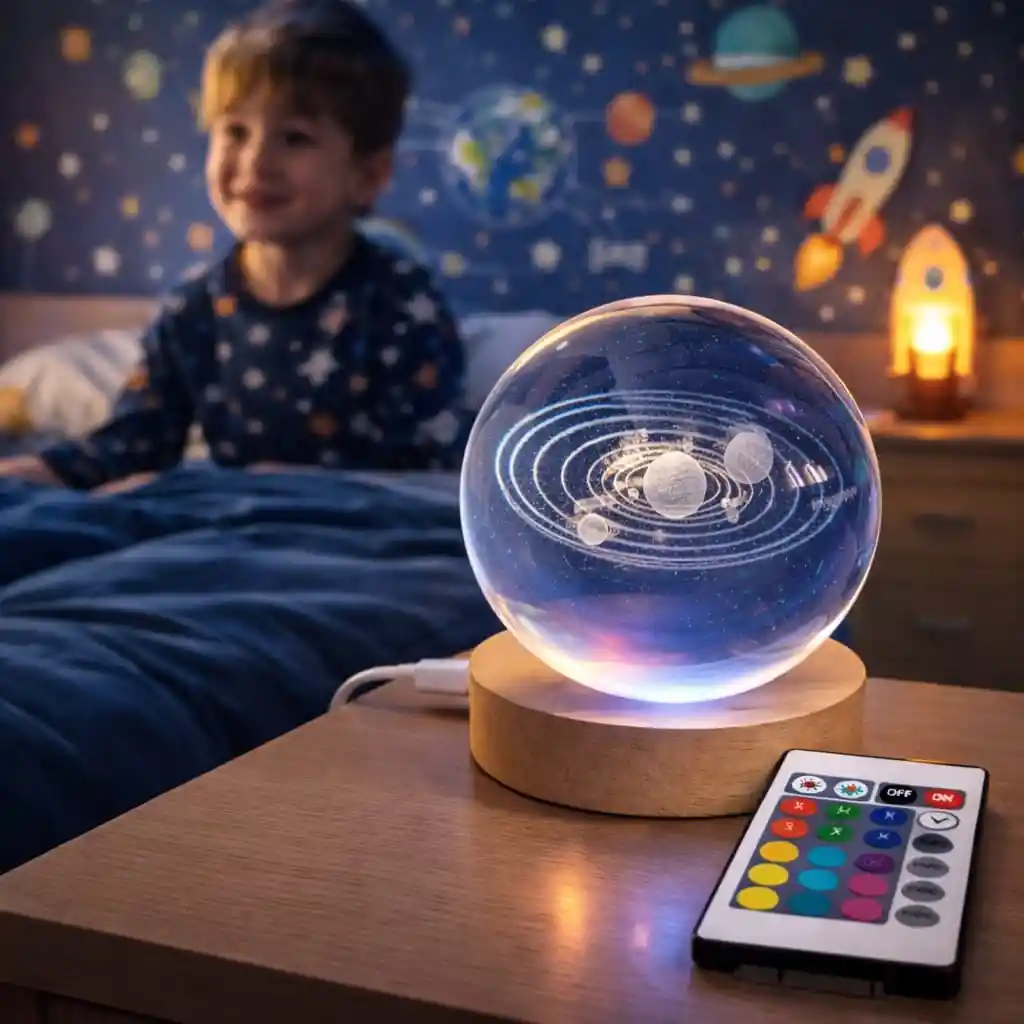 La lámpara bola de cristal 3D con diseño del sistema solar es una pieza decorativa única que ilumina cualquier espacio con un efecto visual elegante y relajante. El grabado láser dentro del cristal muestra los planetas y sus órbitas, creando un efecto tridimensional muy llamativo. Incluye control remoto para cambiar fácilmente los colores y efectos de iluminación, permitiendo crear distintos ambientes según el momento. Es ideal para decoración de habitaciones, escritorios, cuartos infantiles, salas o espacios de estudio. También es una excelente opción como regalo original y decorativo. Funciona mediante conexión USB, por lo que puede usarse con cargadores, computadores o power banks. Características * Bola de cristal con grabado 3D del sistema solar * Iluminación LED multicolor * Control remoto incluido * Base decorativa estilo madera * Alimentación por USB * Ideal para decoración de habitaciones y escritorios Contenido * 1 Lámpara bola cristal sistema solar 3D * 1 Base LED tipo madera * 1 Control remoto * 1 Cable USB