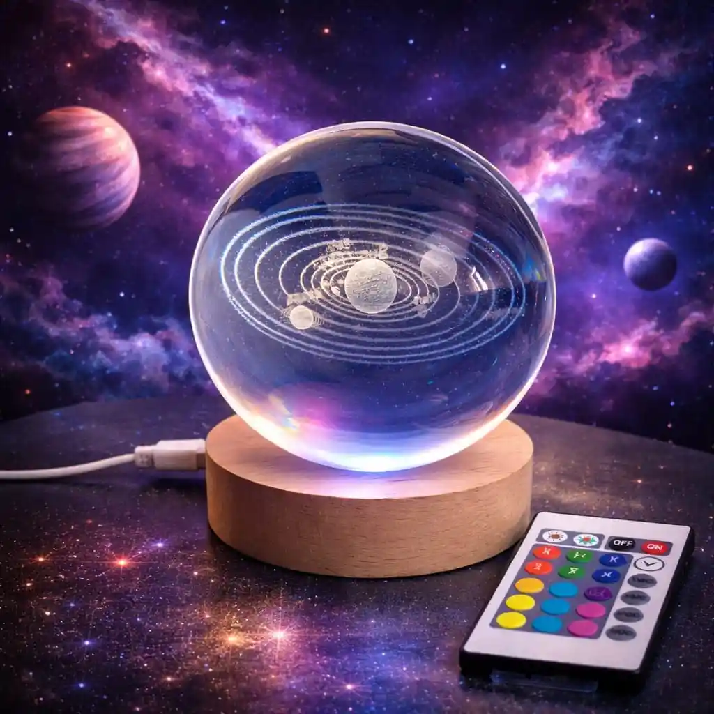 La lámpara bola de cristal 3D con diseño del sistema solar es una pieza decorativa única que ilumina cualquier espacio con un efecto visual elegante y relajante. El grabado láser dentro del cristal muestra los planetas y sus órbitas, creando un efecto tridimensional muy llamativo. Incluye control remoto para cambiar fácilmente los colores y efectos de iluminación, permitiendo crear distintos ambientes según el momento. Es ideal para decoración de habitaciones, escritorios, cuartos infantiles, salas o espacios de estudio. También es una excelente opción como regalo original y decorativo. Funciona mediante conexión USB, por lo que puede usarse con cargadores, computadores o power banks. Características * Bola de cristal con grabado 3D del sistema solar * Iluminación LED multicolor * Control remoto incluido * Base decorativa estilo madera * Alimentación por USB * Ideal para decoración de habitaciones y escritorios Contenido * 1 Lámpara bola cristal sistema solar 3D * 1 Base LED tipo madera * 1 Control remoto * 1 Cable USB