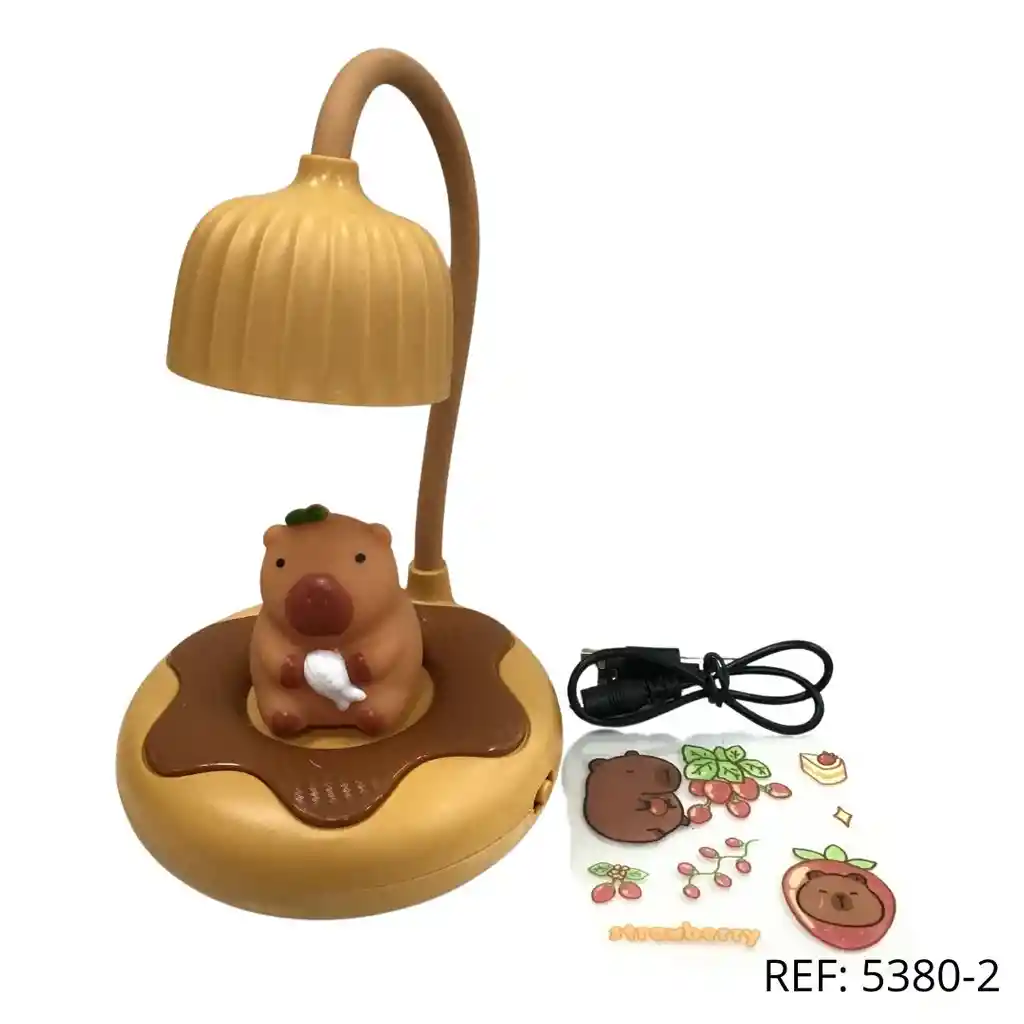 Lámpara LED de capybara sobre base de chocolate. Ideal para escritorio, incluye stickers decorativos.