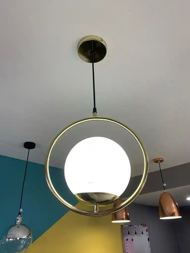 LAMPARA COLGANTE ARO OLYMPUS IV CON ESFERA P-12 BLANCA X1 BOMBILLO E27, DIAMETRO 45CM, PLAFON REDONDO EN LA BASE. Largo del cable 1M.