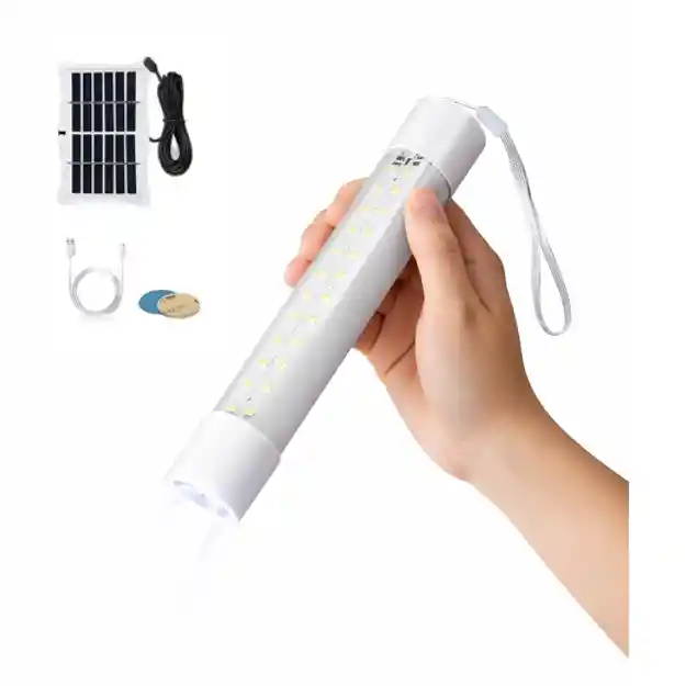 Descripción del producto La Linterna LED Solar Recargable Portátil ofrece una iluminación eficiente, ecológica y práctica tanto en interiores como exteriores. Su sistema de carga dual (solar y USB) permite mantenerla lista para usar en cualquier momento, ideal para emergencias, campamentos, talleres o cortes de energía. Su estructura liviana y alargada brinda una luz uniforme y un manejo cómodo para todo tipo de usuarios. Características principales Iluminación: LED SMD de alta eficiencia (20 unidades) Brillo: 400 – 600 lúmenes, con luz blanca fría (6000–6500 K) Modos de iluminación: alta, media e intermitente/SOS Fuentes de energía duales: panel solar monocristalino (1.5–2 W) o carga USB 5V Batería recargable de ion-litio 1800–2400 mAh Autonomía: 6 a 12 horas de uso continuo Tiempo de carga: USB 3–4 h / Solar 6–8 h Función power bank para carga de celulares y dispositivos pequeños Cuerpo de ABS técnico resistente con difusor acrílico Dimensiones: 22 × 4 × 3,5 cm / Peso: 260 – 320 g Certificaciones: CE, RoHS, FCC Beneficios del producto ✔ Iluminación confiable sin necesidad de corriente eléctrica ✔ Portátil, liviana y fácil de usar en interiores o exteriores ✔ Ahorro energético gracias a su carga solar ✔ Función power bank para mantener tus dispositivos conectados ✔ Ideal para camping, emergencias o uso doméstico Modo de uso Cargue la linterna por USB (3–4 h) o mediante el panel solar (6–8 h bajo luz directa). Presione el interruptor para seleccionar el modo de iluminación deseado. Colóquela sobre una superficie estable o cuélguela con el gancho integrado. Para usarla como power bank, conecte el cable USB a su dispositivo móvil. Limpie el panel solar periódicamente con un paño seco para asegurar una carga eficiente.
