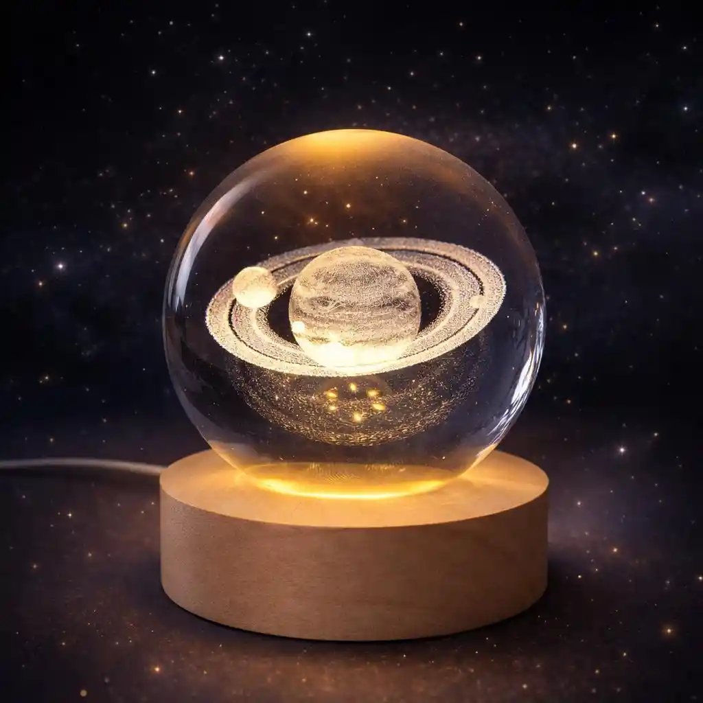 Dale un toque único y futurista a tu espacio con esta lámpara decorativa de esfera de cristal con diseño 3D de planeta Saturno. El grabado tridimensional dentro de la esfera crea un espectacular efecto visual cuando se enciende la base LED, iluminando el planeta con una luz cálida y relajante que transforma cualquier ambiente. Su base de madera natural le da un estilo elegante y moderno, ideal para escritorios, mesas de noche, salas o habitaciones infantiles. Es perfecta como lámpara decorativa, luz ambiental o regalo especial para amantes del universo, la astronomía y la decoración moderna. Características Diseño 3D de planeta Saturno dentro de esfera de cristal Iluminación LED cálida Base de madera decorativa Alimentación mediante cable USB Luz ambiental suave y relajante Ideal para decoración de dormitorio, oficina o sala Medidas Diámetro de la esfera: 6 cm Altura de la base: 2 cm Altura total aproximada: 8 cm Incluye 1 Esfera de cristal grabada en 3D 1 Base de madera con luz LED 1 Cable USB
