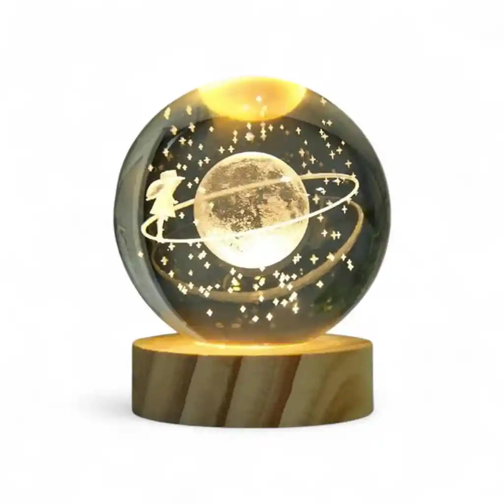 Lámpara decorativa en forma de esfera con grabado 3D de luna y planeta, ideal para crear un ambiente cálido y moderno en cualquier espacio. Su diseño elegante la convierte en una excelente opción para decoración o regalo. Características principales: Esfera de cristal con grabado 3D de alta precisión Iluminación LED cálida Base de madera con conexión USB Efecto visual tipo constelar Diseño compacto y elegante