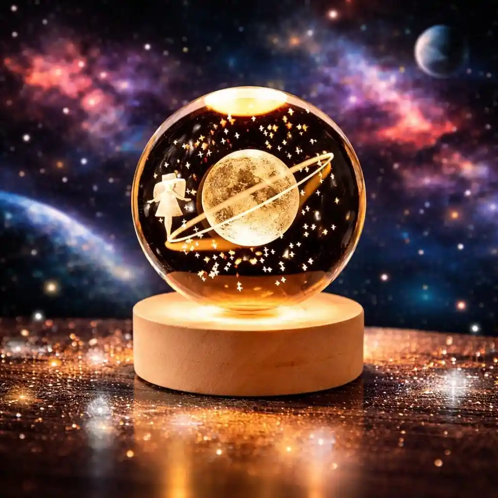 Lámpara decorativa en forma de esfera con grabado 3D de luna y planeta, ideal para crear un ambiente cálido y moderno en cualquier espacio. Su diseño elegante la convierte en una excelente opción para decoración o regalo. Características principales: Esfera de cristal con grabado 3D de alta precisión Iluminación LED cálida Base de madera con conexión USB Efecto visual tipo constelar Diseño compacto y elegante