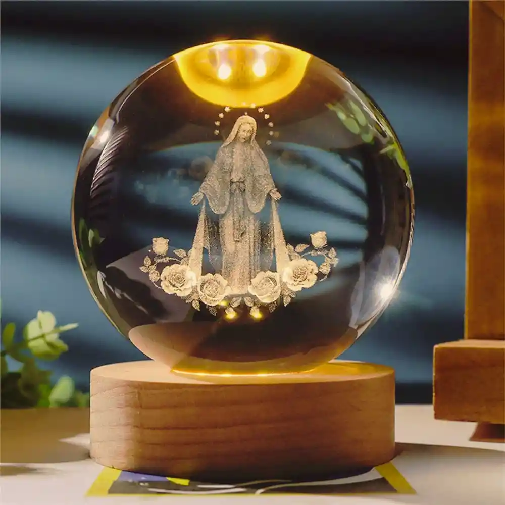 ¡Ilumina tu hogar con la magia del espacio! Nuestra Lámpara Decorativa esfera en 3D - Diseño La Virgen Milagrosa Con Rosas cuenta con un diseño único e innovador, que llamará la atención de todos tus invitados. Efecto de iluminación impresionante, la esfera en 3D crea un efecto de iluminación impresionante. Perfecta para cualquier habitación, desde el dormitorio de los niños hasta la sala de estar. Crea un ambiente calido, con una luz suave y relajante. Fácil de usar, incluye un adaptador de corriente (cable USB). Cuenta con las siguientes características: Figura con base en resina Esfera de cristal Luz LED blanca Base de madera Materiales de alta calidad y duraderos.