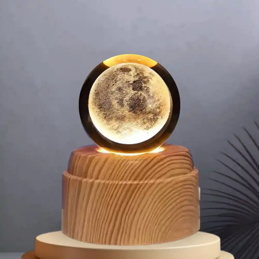 La Lámpara Decorativa Esfera 3D con Base Giratoria Diseño de luna llena destaca por su diseño único e innovador que no pasará desapercibido. Proyecta un efecto de iluminación impresionante que crea una atmósfera relajante gracias a su luz suave, ideal para dormitorios, salas de estar o espacios de estudio. Es perfecta para complementar la decoración de cualquier ambiente, desde el cuarto de los niños hasta áreas comunes. Su uso es muy sencillo e incluye un cable USB con adaptador de corriente para mayor comodidad. Una opción original y decorativa para quienes buscan darle un toque especial a su hogar. CARACTERÍSTICAS: Tipo de luz led Conexión a luz directa Color de luz: cálida Material de base: Pasta con diseño de Madera Material de esfera: Cristal
