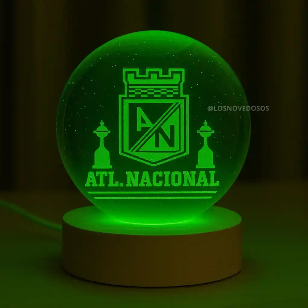 Ilumina tus espacios con el orgullo verde 💚 Nuestra Lámpara Decorativa 3D de Atlético Nacional combina elegancia, tecnología y pasión por el fútbol. Su esfera de cristal con grabado 3D del escudo y trofeos del equipo refleja cada detalle con una iluminación LED que resalta la grandeza del club. Características destacadas: -Diseño exclusivo: Escudo de Atlético Nacional grabado en 3D dentro de una esfera de cristal de alta pureza. -Efecto luminoso impresionante: Luz LED verde intensa que resalta cada contorno y crea una atmósfera moderna y elegante. -Base de madera natural: Aporta un toque cálido y sofisticado, ideal para exhibir en cualquier espacio. -Perfecta para regalar o decorar: Ideal para tu oficina, sala, dormitorio o zona de colección futbolera. -Fácil de usar: Funciona mediante cable USB con adaptador incluido. Detalles técnicos: Material: Cristal óptico + base de madera Luz LED color verde Grabado interno en 3D Tamaño: Esfera grande (decorativa y llamativa) Alimentación: Cable USB Un artículo de colección para verdaderos hinchas verdolagas, hecho para destacar en cualquier rincón de tu hogar o espacio de trabajo.