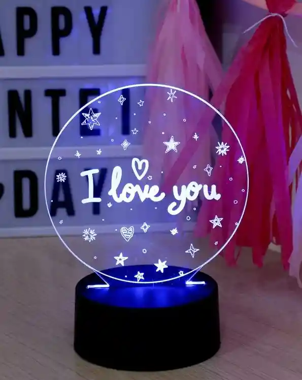 Lámpara LED con leyenda "I Love You" que cambia de color: ideal para decoración o como lámpara de noche. 7 modos de colores diferentes: 6 modos contienen colores sólidos y el séptimo tiene colores que cambian continuamente. Alimentada por usb o baterías AA, permite conectar la lámpara a un computador o cualquier puerto USB, también se puede utilizar a través de la batería AA. Incluye base, baterías y cable USB. Medidas: 14 x 18 cm.