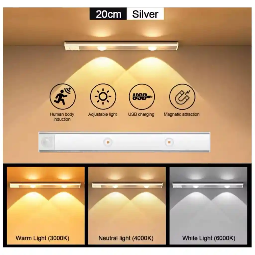 Lámpara LED 20 cm Recargable Sensor Movimiento Descripción del producto: Descubre la luz LED ultrafina y portátil con sensor de movimiento, perfecta para iluminar cualquier espacio de tu hogar o actividades al aire libre. Diseñada para ser versátil, práctica y moderna. Características principales: Tamaños disponibles: 20 cm, Colores de luz: Blanco cálido, natural y frío (3 en 1). Exterior: Disponible en negro, plata y blanco. Energía recargable: Incluye cable USB para cargar fácilmente. Fácil instalación: Parche magnético de hierro para fijar en cualquier superficie metálica. Incluye en el paquete: Luz LED con sensor de movimiento. Parche magnético. Cable de carga USB. Manual de usuario. Aplicaciones amplias: Ideal para iluminar cocinas, armarios, escaleras, pasillos, talleres, garajes y más. Perfecta como luz para maquillaje, lámpara de noche o incluso para acampar al aire libre. Nota importante: Elige el tamaño y número de LEDs que mejor se adapte a tus necesidades antes de realizar tu compra. Añade esta práctica lámpara LED a tu carrito y transforma cualquier espacio con iluminación eficiente y moderna.