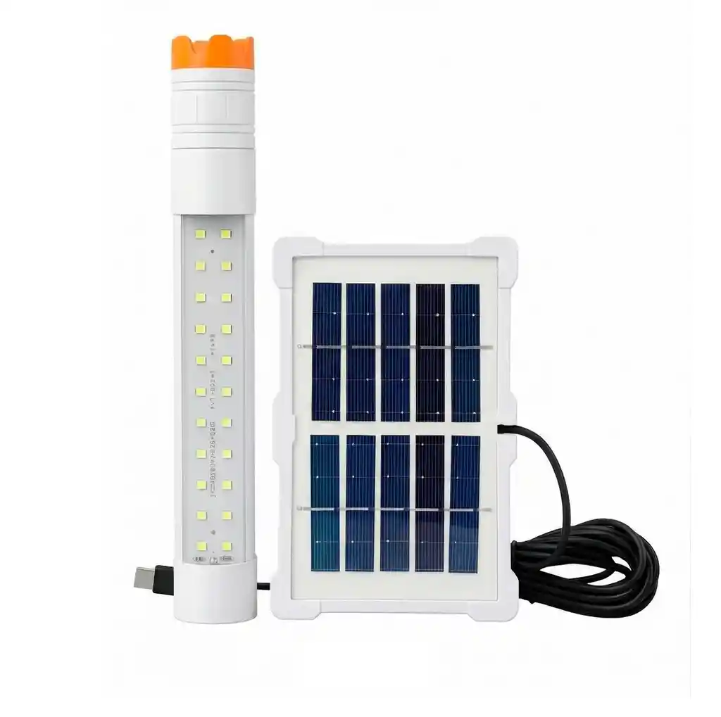Esta versátil lámpara LED multifuncional es la solución definitiva para iluminación en exteriores, camping, emergencias por cortes de energía o trabajos mecánicos, ofreciendo una autonomía excepcional y múltiples modos de carga. Su diseño inteligente combina una barra de luz lateral de alta potencia con una linterna frontal integrada, permitiendo ajustar la intensidad según la necesidad, mientras que sus potentes imanes traseros facilitan el trabajo manos libres al adherirse a superficies metálicas. Fabricada con materiales resistentes al impacto, incluye un panel solar externo de alta eficiencia para carga ecológica y un puerto USB tipo C para recargas rápidas, convirtiéndose en una herramienta indispensable, ligera y fácil de transportar que garantiza luz confiable en cualquier situación y lugar. FICHA TÉCNICA Producto: Lámpara LED de Emergencia y Camping Funciones: Barra de luz (difusa), Linterna frontal (punto) y Función SOS Modos de Iluminación: 4 velocidades/intensidades ajustables Tipo de Carga: Solar (panel externo incluido) y USB Tipo-C Autonomía: Hasta 6 horas de uso continuo (según el modo) Batería: Interna recargable de larga duración Fijación: Sistema de imanes integrados y cordón de sujeción Material: Plástico ABS de alta resistencia y componentes electrónicos Panel Solar: Incluye cable largo para ubicación óptima bajo el sol Dimensiones de la lámpara: 32 cm de largo aproximadamente Color: Blanco con detalles en naranja Garantía: 1 mes por defectos de fábrica POLÍTICA DE GARANTÍA Y RETRACTO Este producto cuenta con 1 mes de garantía por defectos de fábrica (fallas en el sistema de carga o encendido); por favor revise el equipo al recibirlo, ya que no aplica garantía por golpes, humedad interna o cables forzados posteriores al uso. Dispone de máximo 5 días para reportar novedades (piezas faltantes o daños de transporte). Para cualquier devolución por retracto, es indispensable entregar el producto en su empaque original en perfecto estado, con el panel solar y cables completos.