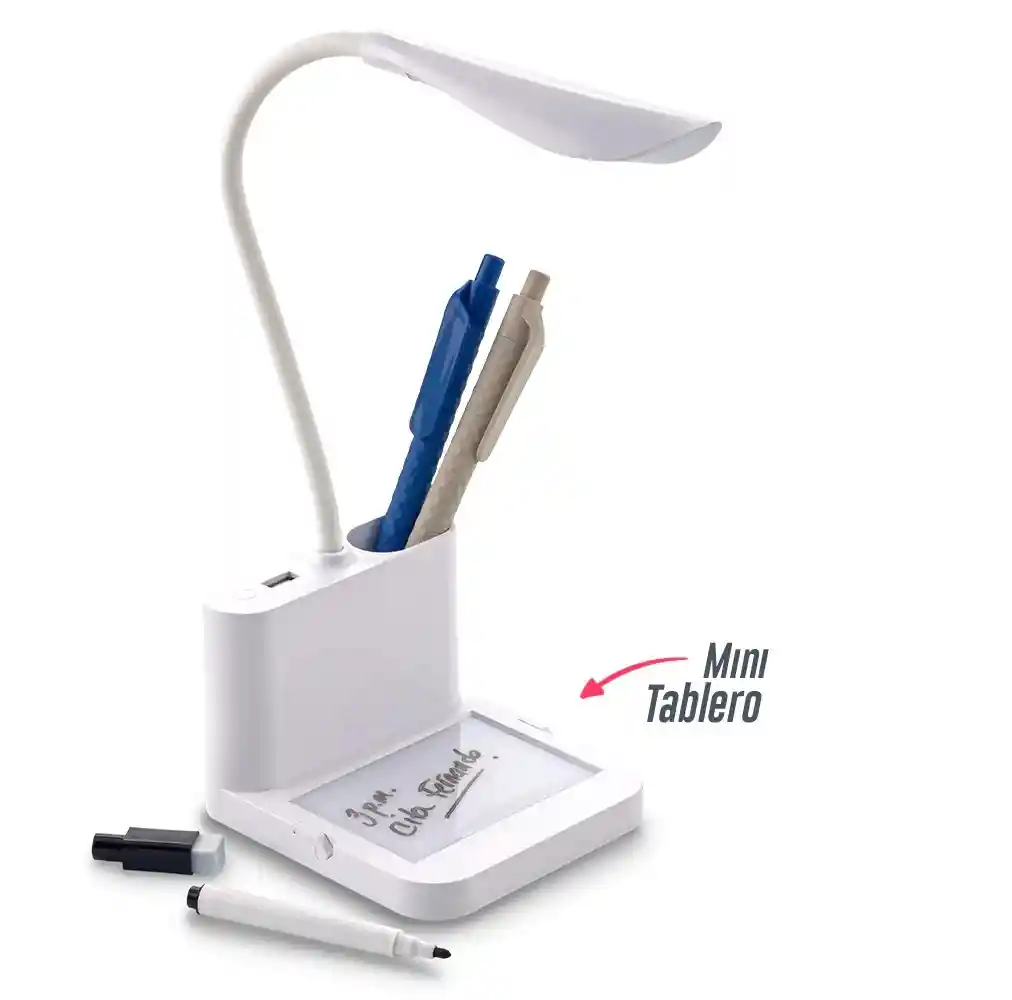 Lámpara LED con mini tablero de mensajes, pestañas de soporte para teléfono, puerto USB para carga y portalápices o portabolígrafo (no incluye bolígrafos). Incluye 1 marcador borrable. Material: ABS + PP + PVC + Silicona. Voltaje de entrada: 1,85 W 0,382 A. Peso neto: 165g. Tres tipos de luz: blanco / cálido / blanco cálido. Empaque caja individual. Medidas Base: 10.8 cm x 12 cm x 8 cm