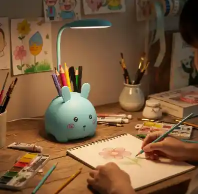 -Luz LED cálida y suave, ideal para proteger la vista infantil. -Cuello flexible y ajustable hasta 180° para dirigir la iluminación. -Portátil y recargable por USB, con autonomía de hasta 5 horas. -Brazo de silicona 360° totalmente adaptable a cualquier ángulo. -Diseño 2 en 1: lámpara + portalápices para mantener el orden. -Compatible con todo tipo de cargadores y dispositivos USB. -Luz cómoda, sin deslumbrar, perfecta para leer o estudiar. -Estilo adorable y colorido que motiva la creatividad de los niños.