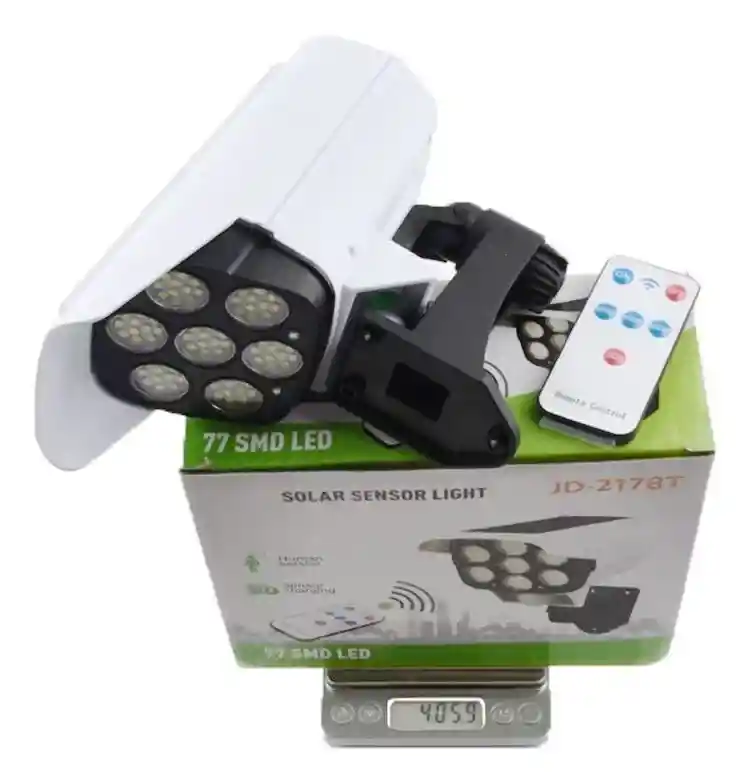 CARACTERISTICAS Sensor de movimiento y diseño de cámara de seguridad para disuadir a los intrusos. Luz blanca brillante para mayor visibilidad. Panel solar con sensor para una carga automática. Modo de luz tenue de ahorro de energía cuando no se detecta movimiento. Encendido automático al detectar la oscuridad. Batería interna recargable de larga duración. Material duradero: ABS. Cantidad de LED: 77. Panel solar: 5,5 V 1,8 W. Retraso de resaltado: 20 segundos. Capacidad de la batería: 2400mAh. Distancia de detección: 3-5 metros. Método de carga: solar. Incluye control remoto para un manejo conveniente a distancia. La lámpara LED para exteriores ofrece 3 modos de iluminación que se pueden cambiar
