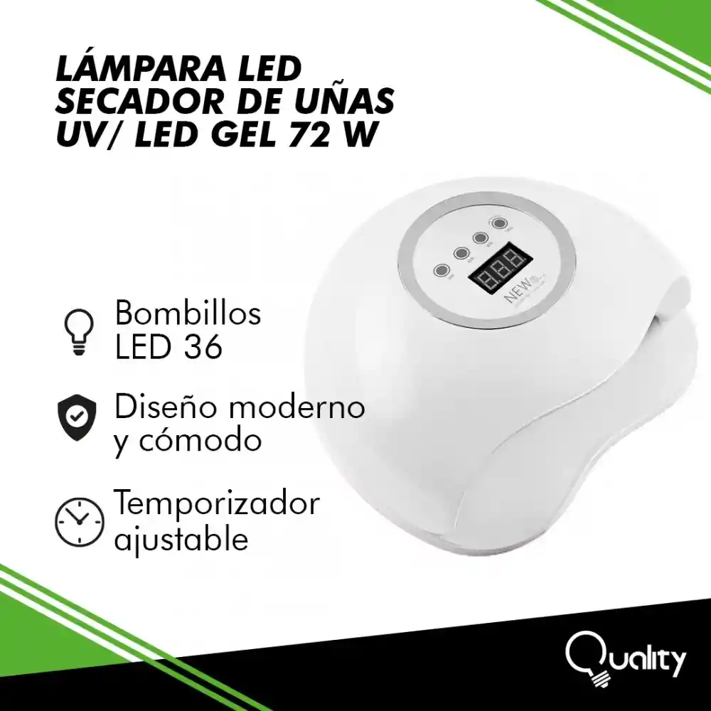 Lampara de uñas Led espacio grande para 2 manos o 2 pies: puede poner totalmente sus 2 manos o pies en la máquina. Sensor automático; pantalla de visualización lcd. Base extraíble; marcador de posición del dedo: la base se puede separar, con el marcador de posición del dedo, guíe dónde colocar los dedos, 36 luces UV, sin zona muerta, todas las uñas pueden estar secas al mismo tiempo. Características: Modelo: SUN X. • Potencia Máxima: 72w. • Longitud de Onda: 365 + 405 nm. • Bombillos led 36. • Tamaño producto: 221 x 205 x 92mm. • Diseño moderno y cómodo. • Fácil de usar. • Botones: 10s 30s 60s on/off 99s modelo calor bajo y doble poder. 1. Secado de todos los geles para uñas: seque rápidamente el gel UV / gel de extensión / gel LED. 2. Alta potencia: secado rápido, solo toma 10-30 segundos para secar el gel. 3. Modo de bajo calor: reduce el calor y brinda una experiencia de secado cómoda. 4. Gran pantalla LCD: fácil de ver el tiempo de secado. 5. Detección infrarroja: detección inteligente, se puede controlar sin presionar botones. 6. Protección contra sobretemperatura: controle de manera inteligente la temperatura para evitar el dolor durante el secado. 7. Fácil de abrir: se puede usar para manos o pies. 8. Modos de sincronización múltiples: 10s / 30s / 60s / 99s Modo de bajo calor.