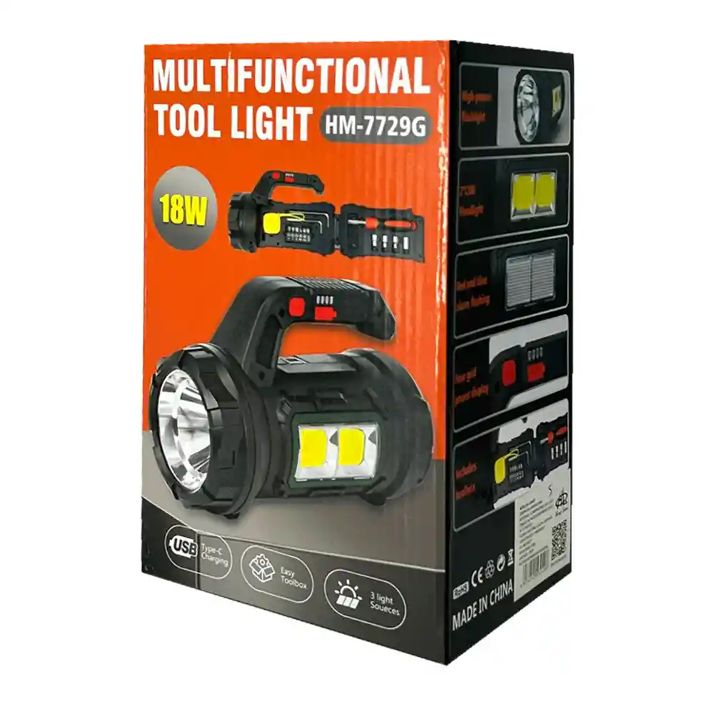 Lámpara linterna portátil multifuncional, diseñada para ofrecer versatilidad y comodidad en diversas situaciones. Con luces intercambiables y un juego de herramientas incluido, esta lámpara es ideal para actividades al aire libre, emergencias y trabajos en el hogar. Características principales: • Tipo: lámpara linterna portátil multifuncional. • Potencia: 18 W. • Modos de iluminación: 3 modos (bulbo T6 + COB). • Material: ABS. • Dimensiones: 215 x 100 x 142 mm. • Peso: 580 g. • Batería: 2400 mAh. • Carga: puerto tipo C, 5 V-2 A. • Tiempo de carga: de 2 a 3 horas. • Autonomía: de 5 a 10 horas dependiendo del modo de uso. • Brillo: 480 lm. • Resistencia al agua: nivel IP44. • Incluye: cable de carga y un juego de herramientas en el compartimento interior (desarmador con variedad de puntas, llaves L, dados y una mini cinta métrica de 1 metro). • Diseño: con agarradera y indicador de batería.