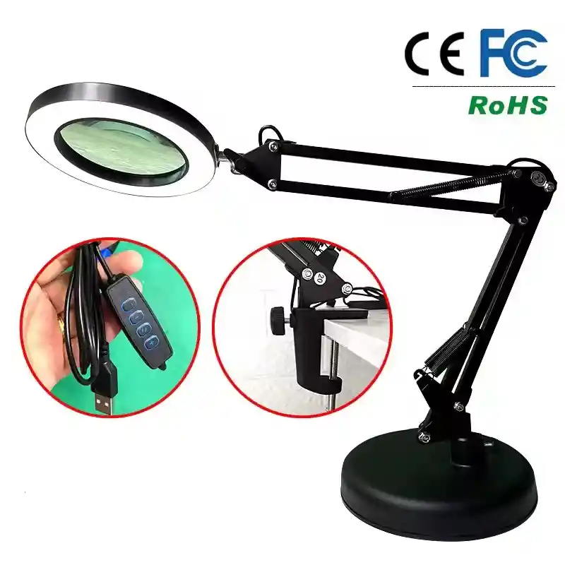Lámpara lupa LED de escritorio con lente de 160 mm, ideal para trabajos de precisión, lectura, manualidades o estética. Brazo articulado ajustable, luz LED clara y uniforme, base estable y alimentación USB. Perfecta para ver detalles con mayor comodidad.