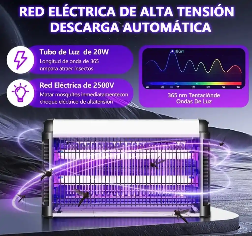 Elimina mosquitos, zancudos y otros insectos voladores de forma rápida, silenciosa y sin químicos con esta potente lámpara mata mosquitos eléctrica de luz ultravioleta (UV) de 20W. Su tecnología atrae a los insectos mediante luz UV y los elimina al contacto, siendo segura para personas y mascotas. Diseñada para uso en interiores, es ideal para hogares, habitaciones, cocinas, locales comerciales, oficinas o bodegas. Su diseño alargado permite una mayor cobertura y eficiencia. Características destacadas: Tecnología UV que atrae y elimina insectos voladores Potencia: 20W Funcionamiento silencioso y sin olores No usa químicos ni pesticidas Bajo consumo de energía Fácil de instalar y limpiar Uso recomendado en interiores Medidas: Largo: 50 cm Alto: 20 cm Ancho: 6 cm