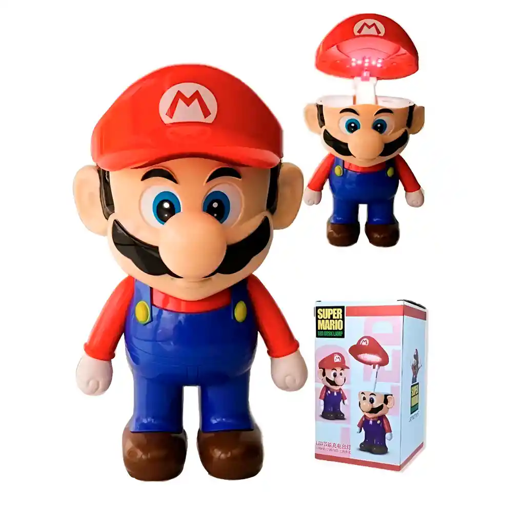 Divertida lámpara en forma de Mario Bros, diseñada con un estilo colorido y llamativo que la convierte en un accesorio único para decorar habitaciones o escritorios. Su gorra roja funciona como tapa abatible que al abrirse revela luces LED brillantes, proporcionando una iluminación práctica y original. Perfecta para fanáticos de los videojuegos y coleccionistas, combina funcionalidad y entretenimiento en un solo producto. //// Contenido de la caja: lampara y cable usb de carga //// Ficha Técnica: Dimensiones: 33 cm x 15 cm x 15 cm Material: Plástico PVC Funcionamiento: Sistema de bateria de recargable interno Edad Recomendada: + 6 años Referencia: GL304 Certificado de conformidad: E5-0359-2021 ** _Para defectos de fábrica o retractos: \_Por favor revise el producto apenas lo reciba y antes de usarlo. No aplican ley de retracto o defectos de fábrica luego de usar el producto. Se manejan máximo 5 días para reportar defectos de fábrica (por ejemplo, producto funciona mal, piezas faltantes, rotas, etc). Para hacer efectiva la devolución el producto debe devolverse con el empaque original, el cual debe estar en buen estado, incluir todos los documentos y las partes completas y sin daños.