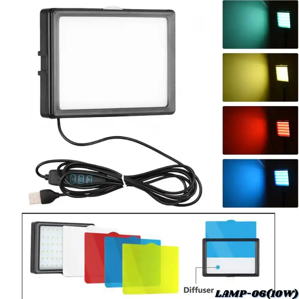Lampara Panel De Luz Led Con Filtros De Color Intercambiables LAMP-06(10W) ¡Ilumina tu creatividad con el Panel de Luz LED, Esta herramienta de iluminación versátil y profesional de 10W es la solución perfecta para añadir color, ambiente y estilo a tus fotografías, vídeos y transmisiones en vivo. Características: - Iluminación Profesional y Versátil: Cuenta con un panel LED de luz blanca brillante y uniforme con temperatura de color 3200 - 5500K, ideal para una amplia gama de aplicaciones de iluminación. - Filtros de Color Intercambiables: Incluye un juego completo de filtros de acetato de colores vibrantes que te permiten crear una gama de efectos de iluminación. - Montaje Compatible con Trípodes: Cuenta con una rosca estándar de 1/4" en la base para compatibilidad con trípodes y soportes de luz, lo que te permite montarlo y colocarlo fácilmente en el ángulo perfecto. - Alimentación USB: Conector USB para alimentación. - Controlador en Línea: Controlador en el cable para encendido/apagado, ajuste de brillo (+/-) y control de modo. Especificaciones: - Potencia: 10W. - Tipo de Luz: Panel LED. - Filtros de Color: X4 filtros de acetato (Azul, Rojo, Verde, Amarillo). - Panel transparente incluido. - Montaje: Rosca estándar de 1/4". - Alimentación: Conector USB. - Control: Controlador en línea. NOTA: No incluye ningún tipo de trípode o soporte de montaje. Nota: Las imágenes publicadas son de referencia, el producto real puede presentar ligeras variaciones en su diseño y tonalidad de color