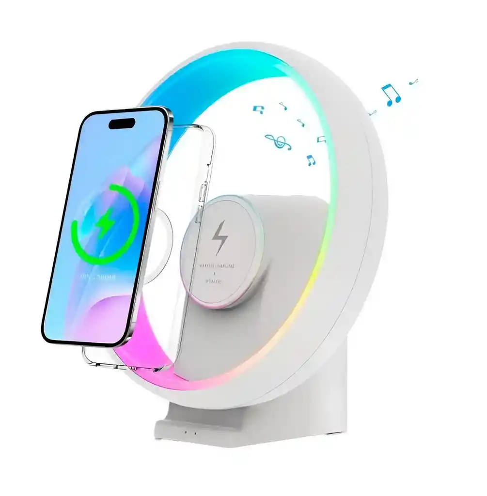 Esta espectacular lámpara inteligente "Halo" es la pieza tecnológica definitiva para transformar tu mesa de noche o escritorio en un centro de entretenimiento y confort. Diseñada con un estilo minimalista y futurista, combina en un solo dispositivo una potente iluminación LED RGB ajustable, un altavoz Bluetooth de alta fidelidad y una base de carga inalámbrica de 10W para tu smartphone. Gracias a sus múltiples modos de luz ambiental, puedes crear la atmósfera perfecta para leer, relajarte o trabajar, mientras disfrutas de tu música favorita sin cables estorbosos. Su estructura ergonómica no solo funciona como un soporte seguro para tu teléfono, sino que también eleva la estética de cualquier habitación, convirtiéndose en el regalo ideal o el accesorio funcional indispensable para quienes buscan tecnología, diseño y practicidad en un solo lugar. FICHA TÉCNICA Producto: Lámpara Inteligente Multifuncional Halo Modelo: PX-02 Funciones: Iluminación RGB, Parlante Bluetooth y Cargador Inalámbrico Potencia de Carga Inalámbrica: 10W Potencia Nominal: 18W Voltaje de Entrada: DC 9V Corriente Eléctrica: 2A Tipo de Luz: LED RGB con múltiples efectos y tonos ambientales Conectividad: Bluetooth (Nombre de emparejamiento: PCXC5002) Dimensiones: 22 cm x 11 cm x 23.6 cm (8.66 x 4.35 x 9.29 pulgadas) Compatibilidad: Smartphones con tecnología de carga inalámbrica (Qi) Características adicionales: Soporte integrado para teléfono, botones de control físico Garantía: 1 mes por defectos de fábrica POLÍTICA DE GARANTÍA Y RETRACTO Este producto cuenta con 1 mes de garantía por defectos de fábrica (fallas en el sistema de carga, luces o conexión Bluetooth); por favor revise el artículo al recibirlo, ya que no aplica garantía por golpes, humedad o uso de adaptadores de voltaje inadecuados. Dispone de máximo 5 días para reportar novedades (piezas faltantes o daños de transporte). Para cualquier devolución por retracto, es indispensable entregar el producto en su empaque original en perfecto estado, con todas sus partes y manuales completos.