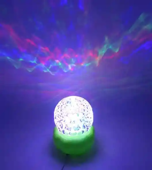 Lámpara LED giratoria decorativa con base verde ,naranja e iluminación multicolor, 13×13 cm Esta moderna lámpara, ideal para la habitación infantil, juvenil encantará a todos Al encenderla, la bola gira mientras una intensa iluminación LED multicolor le da brillo y estilo al espacio.