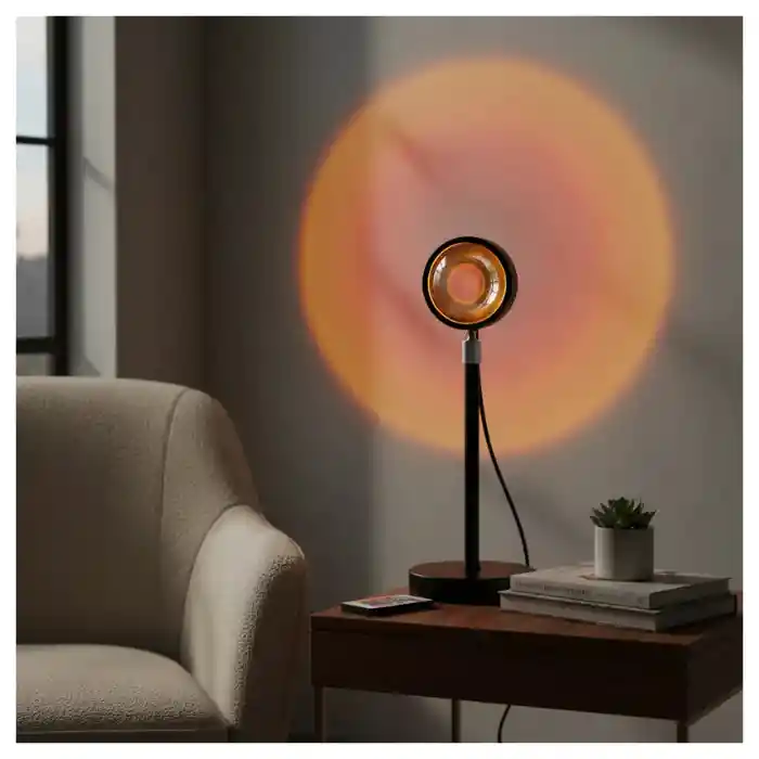 La Lámpara Proyectora USB Luz Atardecer transforma cualquier espacio en un ambiente acogedor y relajante. Con su tecnología de iluminación LED, proyecta un hermoso efecto de atardecer en las paredes y techos, creando un entorno ideal para descansar, meditar o disfrutar de una velada especial. Su diseño elegante y minimalista, realizado en plastico, se integra fácilmente en cualquier estilo decorativo.