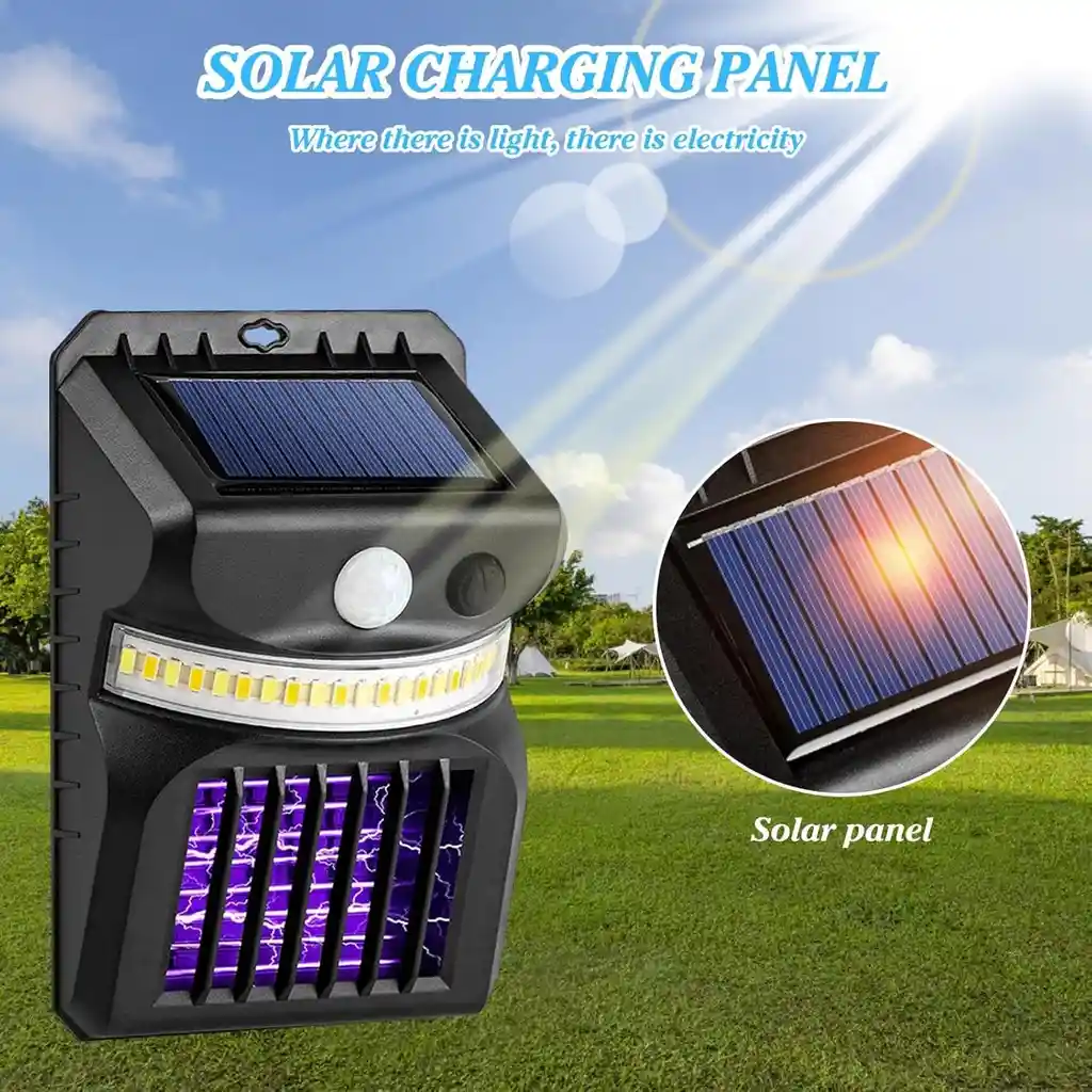 Bombilla: 11x5730 luz blanca + 10x5730 luz amarilla + 5x2835 púrpura * Pulsación larga para cambiar la fuente de luz: (luz blanca, luz amarilla). * Bombilla: 11x5730 luz blanca + 5x2835 luz púrpura * Tiempo de funcionamiento: siempre encendido durante 3-4 horas * Sensor de movimiento: aproximadamente 10 horas * Tiempo de carga: 12 horas para carga solar * Batería: 1*18650, 1200mAh (batería externa) * Material: ABS * Carga Solar: luz púrpura para atraer mosquitos, descarga eléctrica para matar mosquitos. FUNCIÓN: * El primer modo: sensor de movimiento PIR, la luz brilla durante unos 25 segundos. * El segundo modo, sensor de movimiento PIR, la luz brilla durante unos 25 segundos y la luz púrpura siempre está brillante. * El tercer modo, la luz siempre está encendida + la luz plana siempre está encendida.