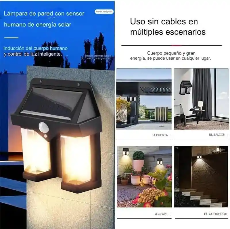 * Lampara de pared solar automática * Fuente de alimentación: energía solar * detección automática * 3 Modos de iluminación * La cantidad de luz equivale a la emitida por 1 bombillo incandescente de 40 vatios * Luz cálida * brillo 1200lm * impermeable Ip65 * Batería de alta capacidad de 1800 mAh. * Material: ABS de alta calidad * Tiempo de Carga: 6-8 horas (con luz solar directa) * Resistente al viento, al polvo y a la decoloración, la deformación y la corrosión. * Apertura automática al anochecer y cierre automático al amanecer * A prueba de óxido, impermeable, resistente al calor, fácil de instalar en cualquier superficie * Perfecta para patio, camino, entrada, edificios, como porches, buzones, patios, garajes, patios y graneros. Pasillos, balcones, jardines * Dimensiones: alto 15 cm x ancho 14.5cm x profundidad 4.8cm MODOS: •Modo 1: Modo de detección del cuerpo humano (iluminado cuando alguien pasa, apagado 20 segundos después de salir) •Modo 2: modo de detección de cuerpo humano con poca luz (iluminado 20 segundos después de que alguien pasa, se enciende de nuevo antes de salir) •Modo 3: Modo de luz constante (sin modo de detección de cuerpo humano, luz siempre encendida), múltiples modos para varios escenarios, adecuado para la mayoría de las ocasiones