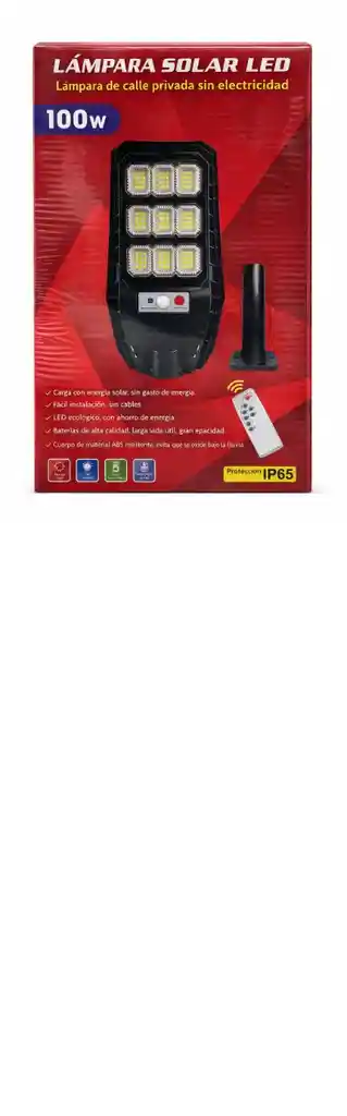 medida caja por unidad 30x17x4 ⚡ Características principales ? Potencia real de 100W: iluminación fuerte y uniforme ?️ Certificación IP65: resistente al agua y al polvo (ideal para exterior) ☀️ Energía solar: ahorro total en consumo eléctrico ? Sensor de movimiento: se activa automáticamente al detectar presencia