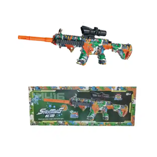 El Shooting Elite M416 es un lanzador manual de agua ideal para juegos al aire libre. Su diseño inspirado en el estilo M416 y su acabado multicolor tipo graffiti lo convierten en un juguete atractivo, seguro y fácil de usar. Funciona mediante un sistema de bombeo mecánico que genera presión para expulsar el agua, ofreciendo un manejo sencillo y completamente manual. Incluye accesorios desmontables como mira decorativa, adaptador para botella y silenciador frontal, lo que permite personalizar su apariencia mientras se mantiene ligero y resistente. Especificaciones Dimensiones y construcción • Longitud: 540–580 mm • Altura con mira: 210–240 mm • Ancho: 45–55 mm • Peso: 380–500 g • Material principal: Polímero ABS de alta dureza • Accesorios: ABS moldeado • Acabado: Gráfica multicolor tipo graffiti Sistema de funcionamiento • Mecanismo: Bombeo manual mecánico • Cámara interna de agua: 80–120 ml aprox. • Recarga alterna: Conexión a botella estándar (adaptador incluido) • Tipo de boquilla: Punta de expulsión unidireccional • Alcance efectivo: 6–10 metros • Flujo por disparo: 8–15 ml • Modo de disparo: Manual (un disparo por ciclo de bombeo) Accesorios incluidos • Mira decorativa estilo óptica • Silenciador decorativo desmontable • Adaptador para botella de agua • Tapón de seguridad para cámara interna • Riel superior decorativo tipo Picatinny Seguridad • Potencia limitada por mecanismo manual • Sin componentes eléctricos • Materiales sin bordes cortantes • Recomendado para mayores de 6 años con supervisión Características • Lanzamiento de agua por sistema de bombeo manual. • Diseño temático M416 con acabado gráfico resistente. • Cuerpo ligero y firme para fácil maniobrabilidad. • Boquilla diseñada para buena dirección del chorro. • Compatible con recarga mediante cámara interna o botella externa. • Totalmente mecánico: no usa baterías. • Accesorios desmontables para personalizar el dispositivo. Beneficios • Permite juegos acuáticos seguros al aire libre. • Peso reducido para uso prolongado sin fatiga. • Mayor autonomía gracias a conexión con botellas externas. • Sin necesidad de baterías ni recargas eléctricas. • Control total del flujo por parte del usuario. • Acabado decorativo que lo identifica claramente como juguete. Modo de uso Retire la tapa o instale el adaptador para botella. Llene la cámara interna o conecte una botella con agua. Ajuste los accesorios si desea usarlos. Tire del mecanismo de bombeo hacia atrás. Empuje hacia adelante para generar presión. Apunte hacia una zona segura al aire libre. Bombee nuevamente para lanzar el chorro de agua. Repita para cada disparo. Vacíe el agua restante al finalizar. Seque y almacene en un lugar sin humedad.