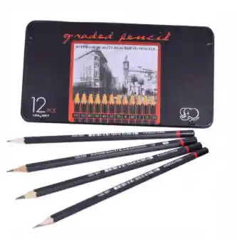 El set incluye 12 lápices de grafito. Los lápices están hechos de madera y grafito de alta calidad 2H, H, HB, F, B, 2B, 3B, 4B, 6B y 8B, lo que permite crear desde líneas finas y precisas hasta sombras suaves y profundas.