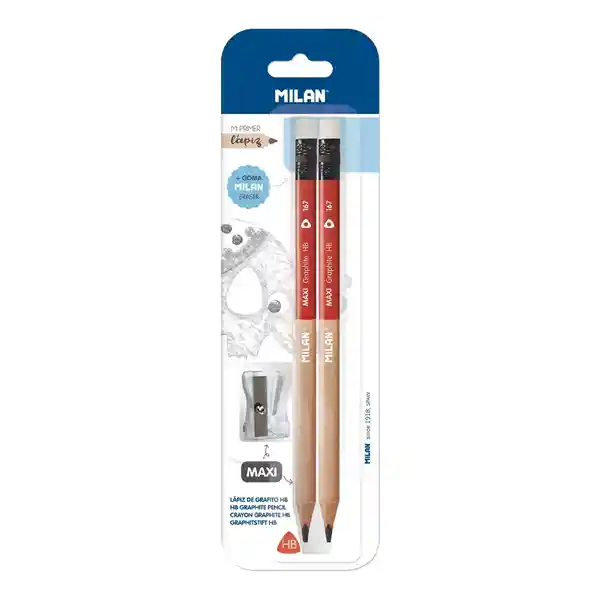 Lápiz MAXI de grafito HB con goma de gran tamaño y mina de 3,5 mm Ø. Forma triangular ergonómica. La graduación HB es una dureza de grafito media, recomendada para escritura y dibujo. El sacapuntas MAXI tiene una cuchilla de acero afilada y resistente, ideal para todo tipo de lápices. Cuchilla de seguridad: este sistema evita que se pueda separar la hoja del cuerpo del sacapuntas, siendo óptimo para uso escolar. Plástico transparente.