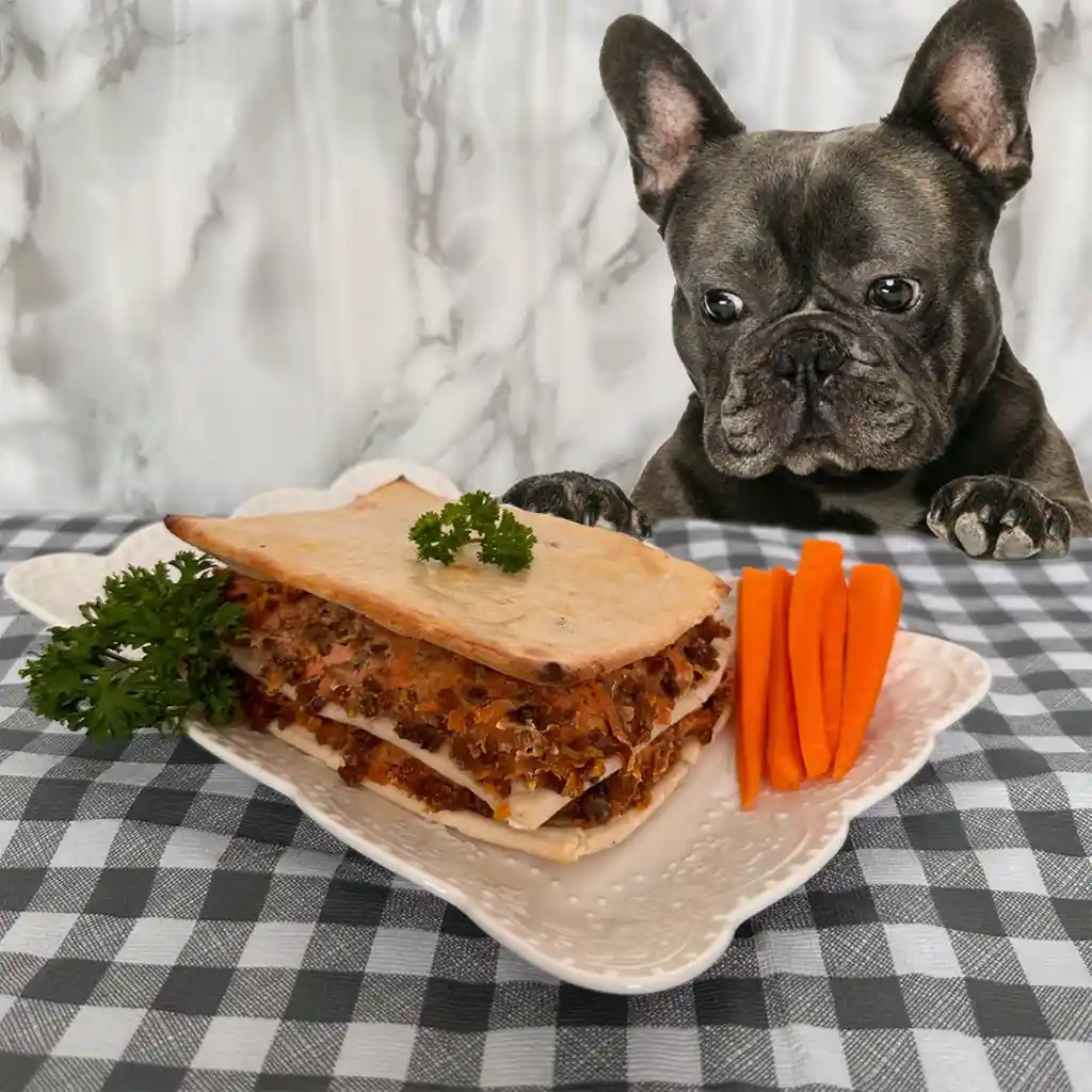 lasaña para perros elaborada artesanalmente con ingredientes 100% naturales aptas para nuestros perrijos. 1 lasaña de carne des res y zanahoria 2 empanadas de higado tostado 2 helados surtidos. INGREDIENTES -carne de res -zanahoria -pasta artesanal * hígado tostado -pechuga de pollo