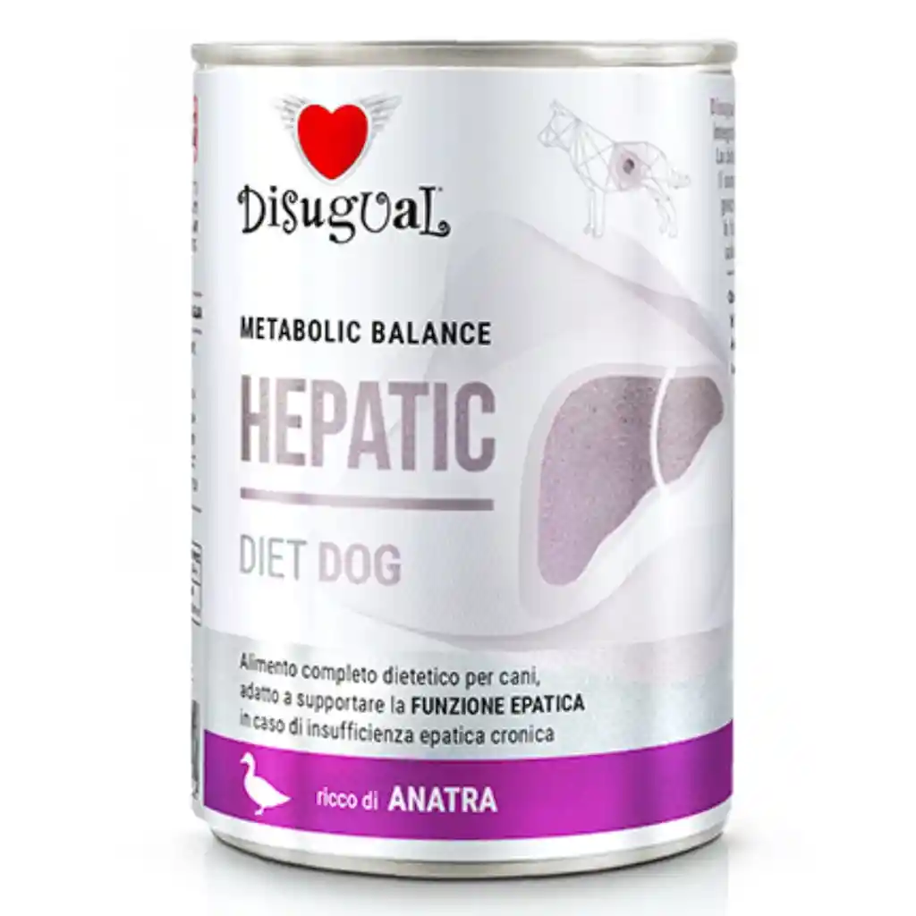 Disugual Perro Lata Hepatic Pato Alimento para perros con problemas hepáticos. Formulado con ingredientes de alta calidad y bajo contenido de cobre para cuidar el hígado. Contiene prebióticos para una digestión saludable y ácidos grasos omega-3 para un pelaje brillante. Ideal para perros con insuficiencia hepática crónica