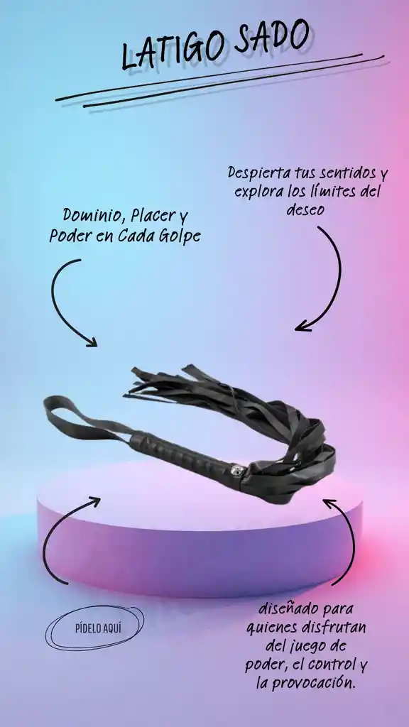 Son uno de los preferidos en la practica sadomasoquista. Se usan para golpear la piel produciendo dolor y dejando que quien lo reciba se sienta dominado o quien lo hace se sienta poderoso. Color: Negro Material: Cuero sintético torneado