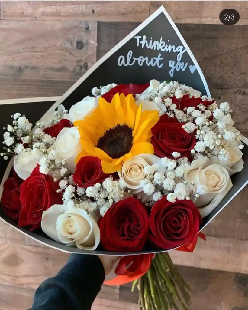 Elegante ramillete realizado con rosas y un girasol. Es un arreglo de mano grande, clásico y muy lindo. de color Multicolor ideal para el Felicitaciones