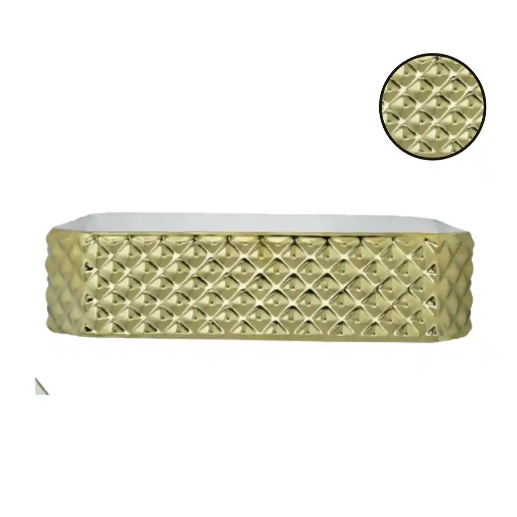 Lavamanos cerámico decorativo de diseño rectangular con acabado dorado brillante y textura tipo diamante. Ideal para transformar cualquier baño en un espacio sofisticado, moderno y elegante. Su diseño de sobreponer lo hace fácil de instalar sobre muebles o encimeras, aportando estilo y lujo sin necesidad de remodelaciones complejas. Características del producto: Material: Cerámica esmaltada de alta resistencia Color: Dorado exterior con interior blanco Acabado: Brillante con textura diamante Medidas: 50 cm largo x 37 cm ancho x 15 cm alto (aproximadas) Tipo de montaje: Sobreponer Cantidad de agujeros: 1 Tipo de control compatible: Monocontrol Uso recomendado: Baños residenciales, baños sociales, baños comerciales Modelo: Lavamanos Textura Diamante Dorado Garantía: 12 meses por defectos de fabricación Incluye filtro: No Este lavamanos está diseñado para quienes desean un baño con acabados de lujo, manteniendo durabilidad y funcionalidad. Producto distribuido al por mayor o al detalle por Pamo Colombia. Las fotografías, medidas y colores pueden variar levemente respecto al producto físico.