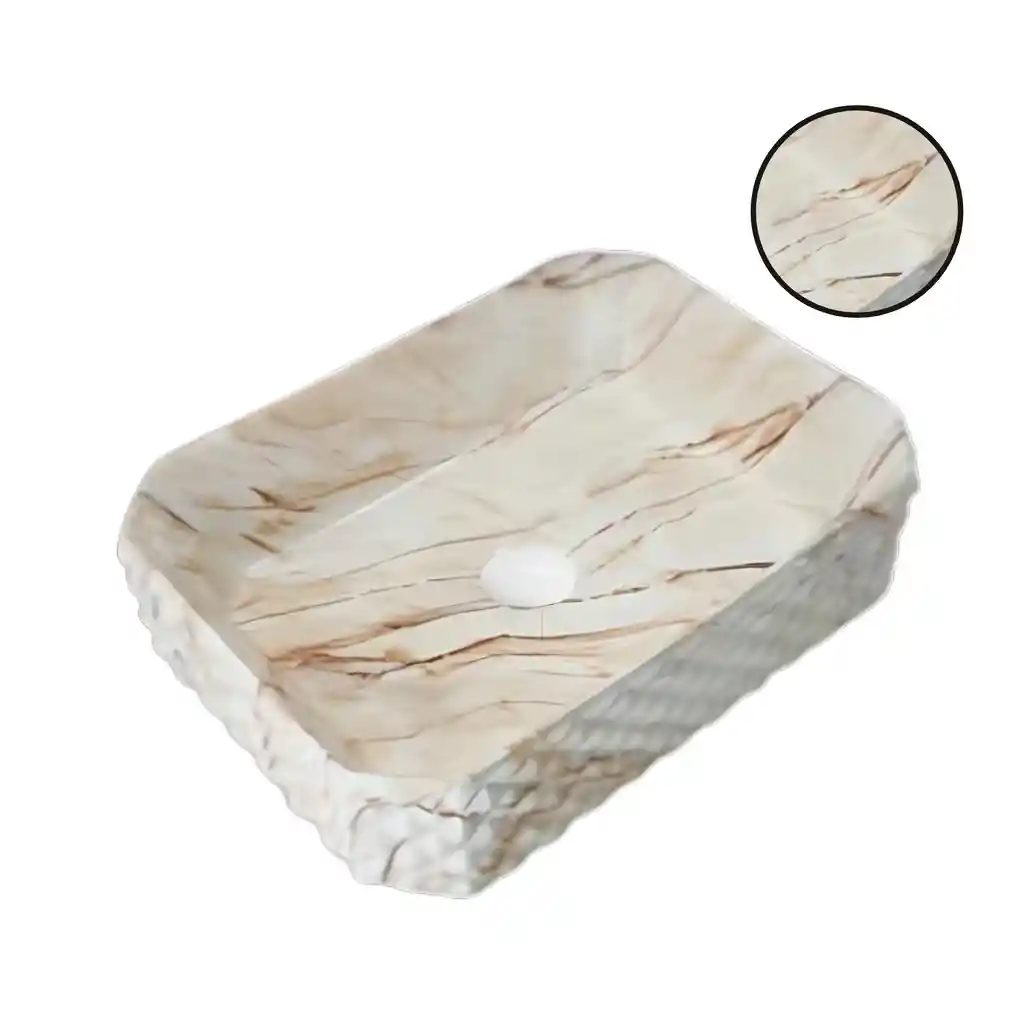 Lavamanos decorativo de cerámica rectangular con diseño de vetas en mármol beige y textura lateral en relieve, ideal para baños modernos, sociales o comerciales. Su acabado brillante tipo mármol realza la elegancia de cualquier espacio, mientras que su forma rectangular permite una instalación cómoda sobre mueble o encimera. Fabricado en cerámica de alta resistencia, este lavamanos no solo es estético sino también duradero y fácil de limpiar. Su textura lateral le aporta un toque artesanal único que marca tendencia en decoración de interiores. Características del producto: Material: Cerámica esmaltada Color: Beige con vetas tipo mármol Acabado: Brillante Forma: Rectangular Instalación: Sobreponer Medidas aproximadas: 48 cm largo x 34 cm ancho x 13 cm alto Tipo de uso: Baño residencial, social o comercial Modelo: Lavamanos Mármol Beige Rectangular Textura No incluye grifería ni desagüe Producto distribuido al por mayor o al detalle por Pamo Colombia. Las fotografías, medidas y colores pueden presentar ligeras variaciones respecto al producto físico.